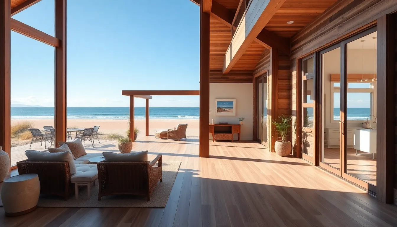 Natural materials play a crucial role in coastal architecture. Wood, stone, and glass often dominate designs, harmonizing with beach landscapes. These materials not only enhance aesthetics but also promote durability against harsh coastal conditions. Locally sourced options reduce environmental impact while maintaining cultural relevance. For instance, cedar shingles resist moisture and weather, proving ideal for coastal homes. Sustainable practices also emerge through using recycled materials, contributing to overall eco-friendliness. Architects favor materials that blend seamlessly with the environment, ensuring structures look as if they naturally belong on the shore.